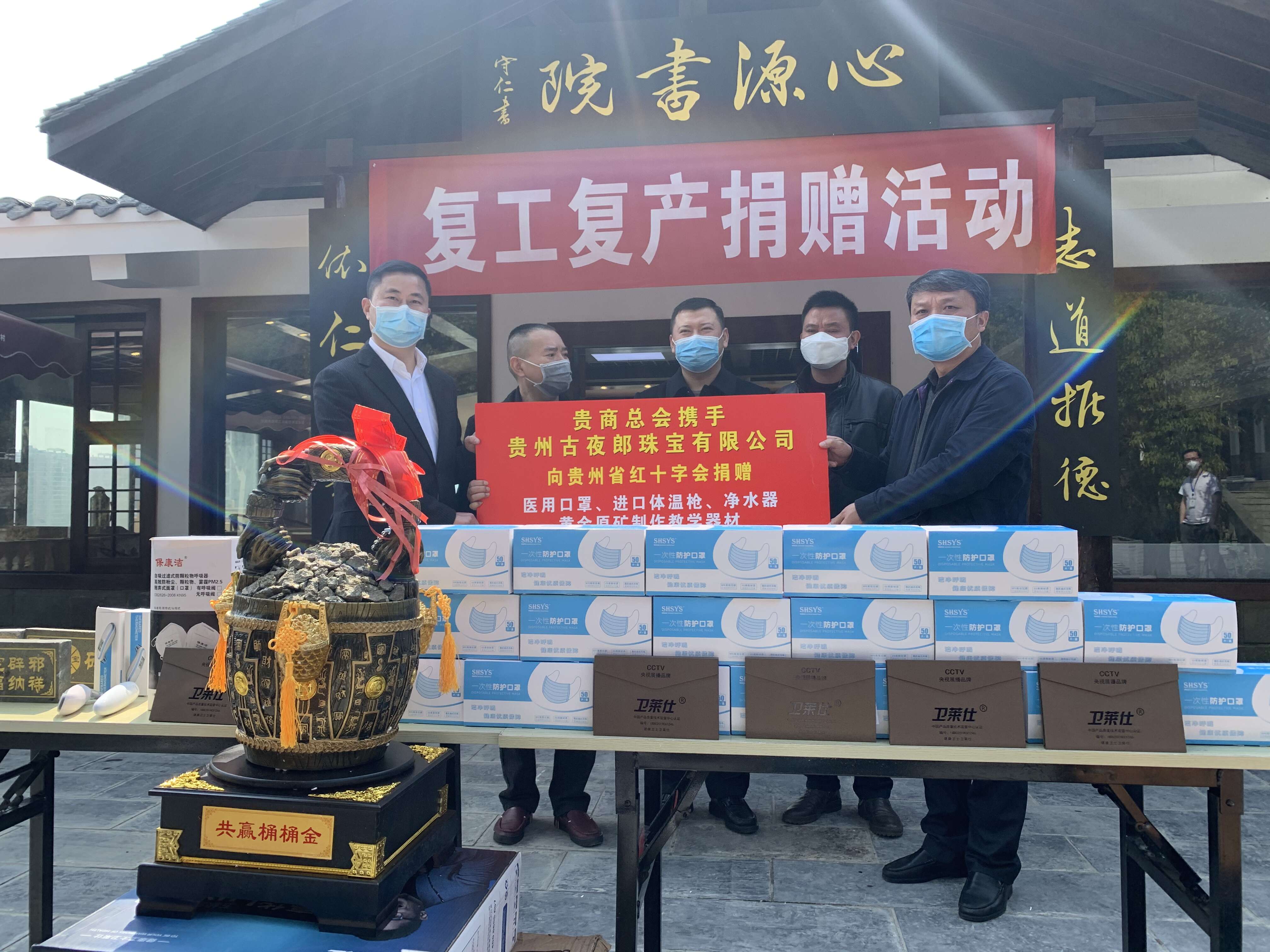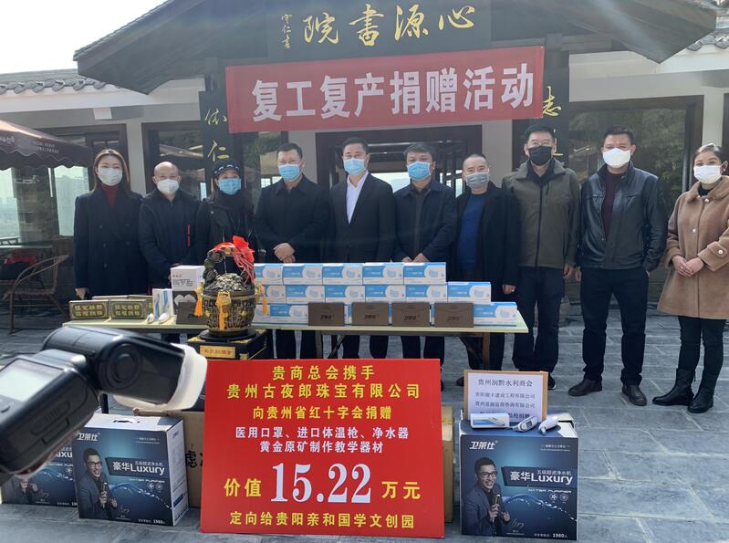 2020年3月6日下午,由贵商总会牵头,携手古夜郎珠宝有限公司在亲和国学文创园举行捐赠活动。参加活动的有:贵商总会常务副会长兼秘书长孔祥柱;古夜郎珠宝有限公司董事长蔡泽成;云岩区工商联主席罗立;贵州省中小企业联合会秘书长马晓春;云岩区中小企业会长杨敏等。向贵州省红十字会,捐赠医用口罩、进口体温枪、净水器、黄金原制作等教学器材,价值15.22万元,定向捐赠给贵阳亲和国学文创园。